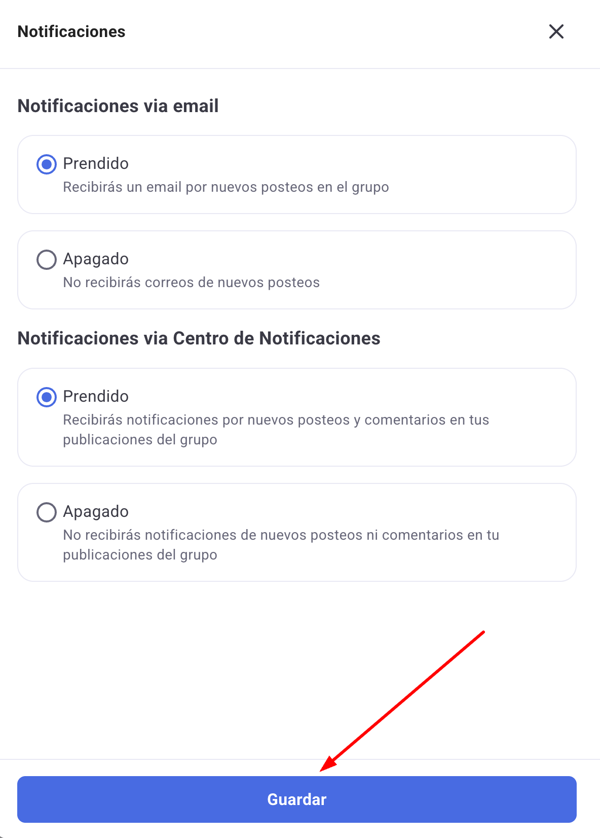 4. Una vez dentro, podrás configurar si deseas recibir notificaciones de posteos via email y via Centro de Notificaciones. Cuando termines de configurar las opciones, haz click en "Guardar", ¡y listo!
