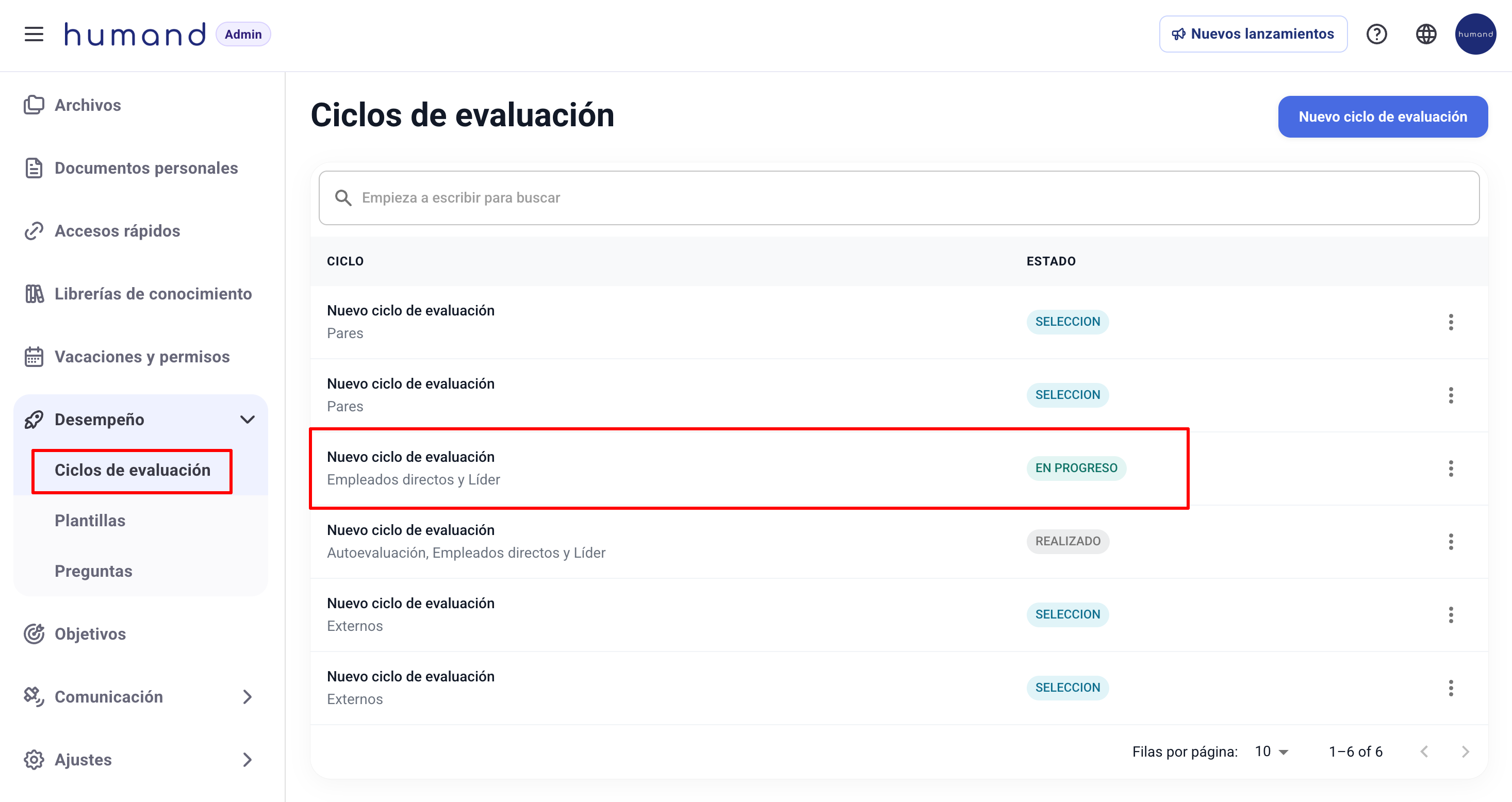 2. Ir a la sección de Desempeño > Ciclos de evaluación, e ingresar al ciclo en cuestión.