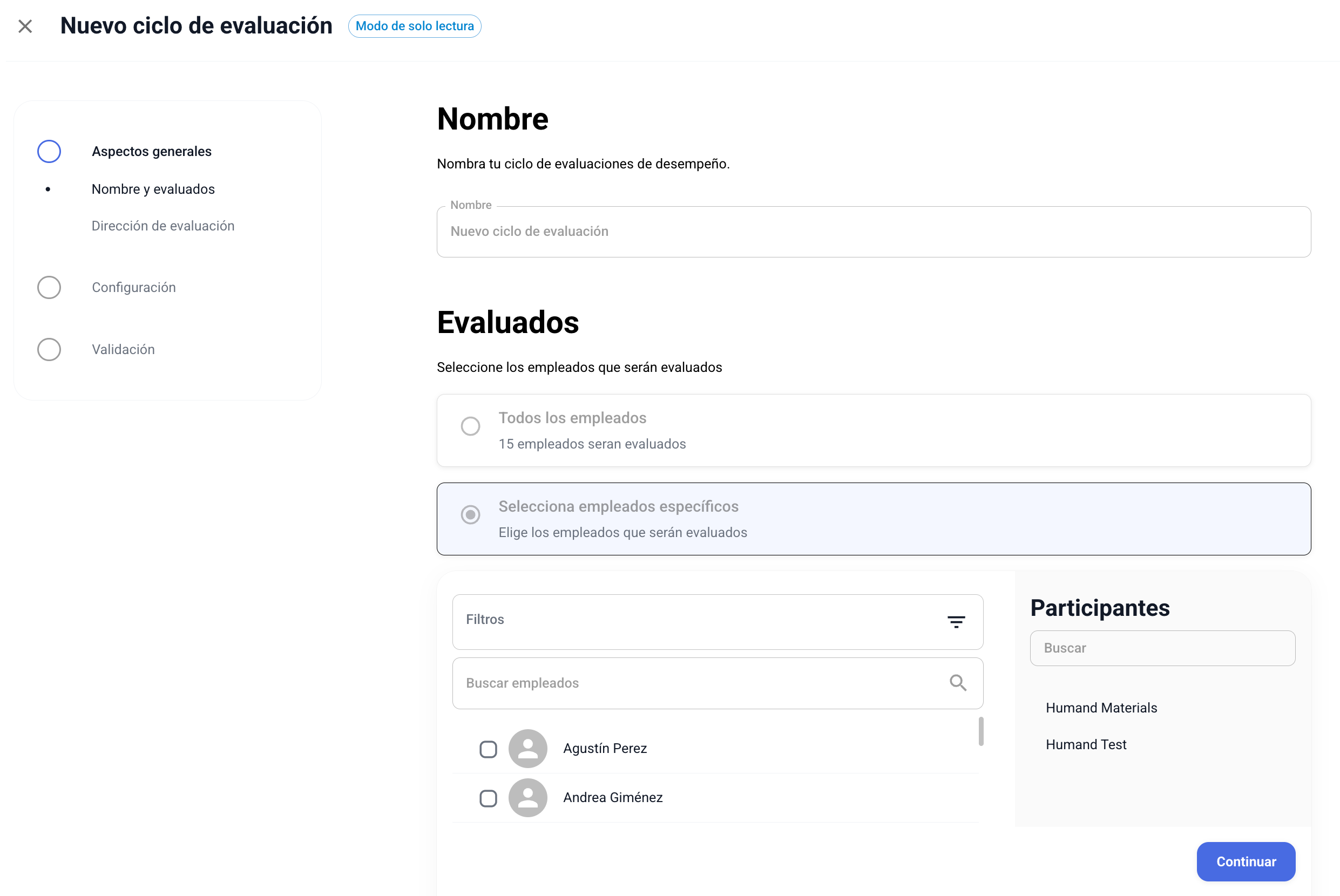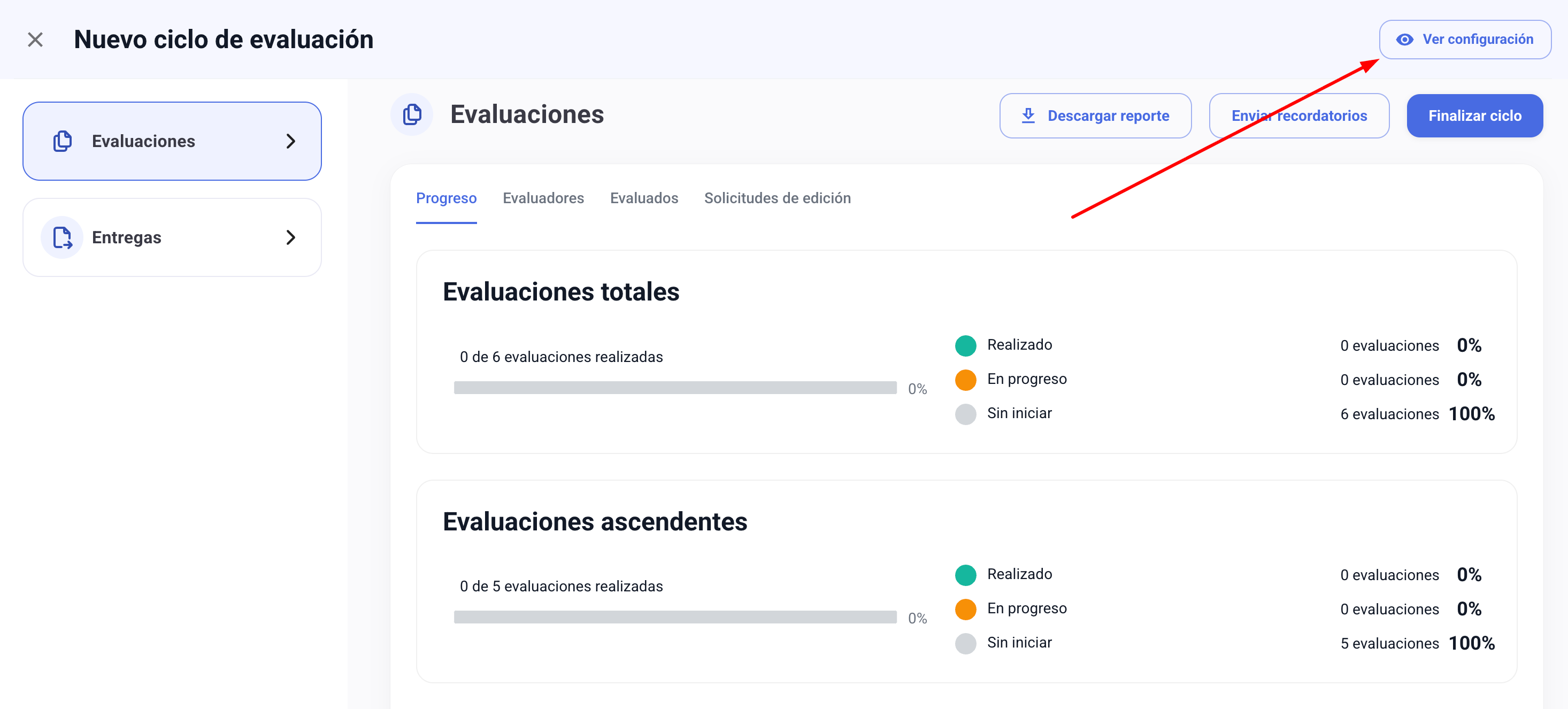 Los usuarios administradores pueden visualizar la configuración de cualquier ciclo de evaluación. Para acceder a esta información debes seguir los pasos indicados a continuación: