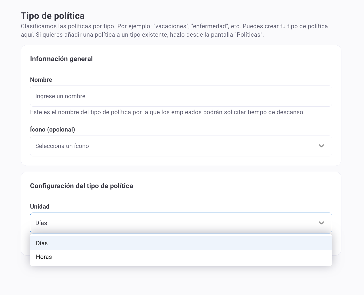 Por último, podrás configurar la unidad de tiempo que quieres que los colaboradores soliciten. En este campo, selecciona la opción "Días".