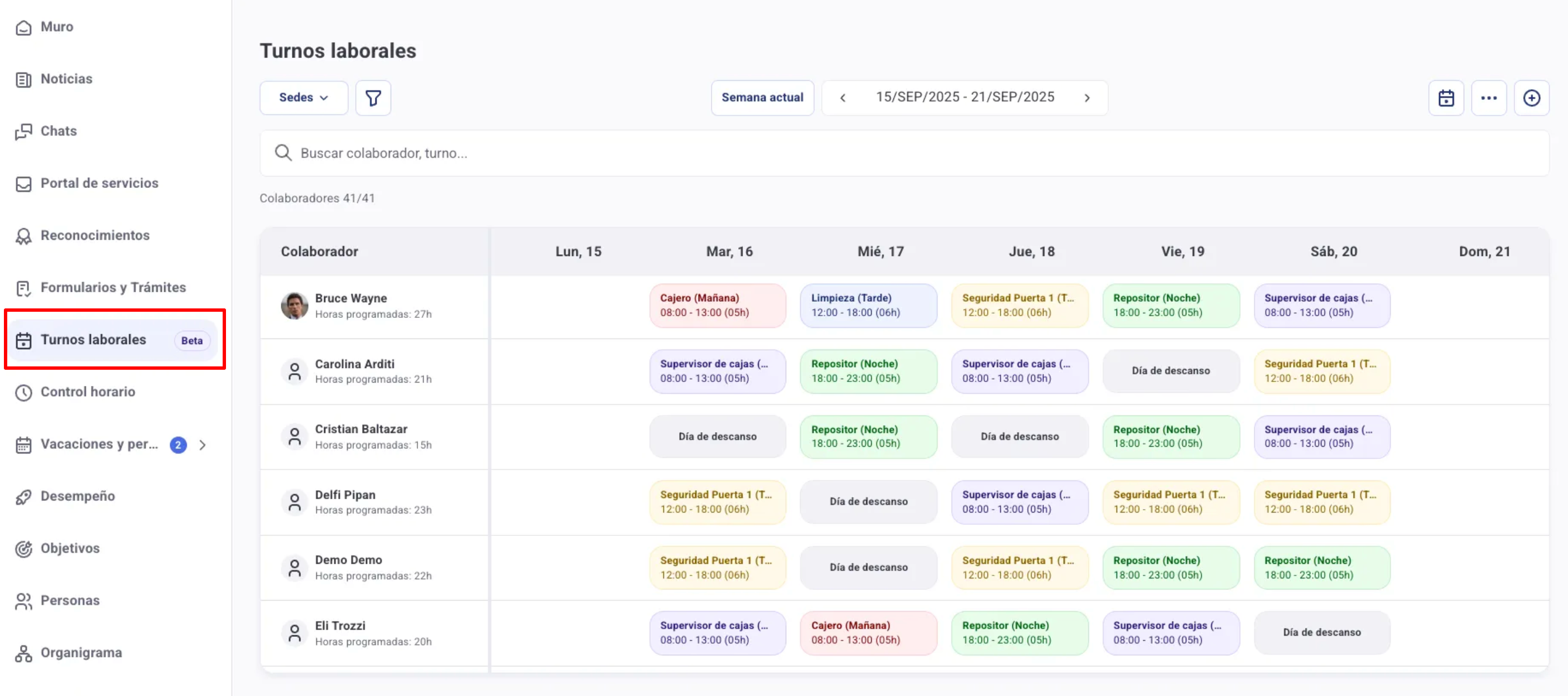 - Turno: Le indican al sistema que ese día es un día laborable y que el colaborador debe trabajar en ese rango horarios. Es posible asignar uno o más turnos en un mismo día.