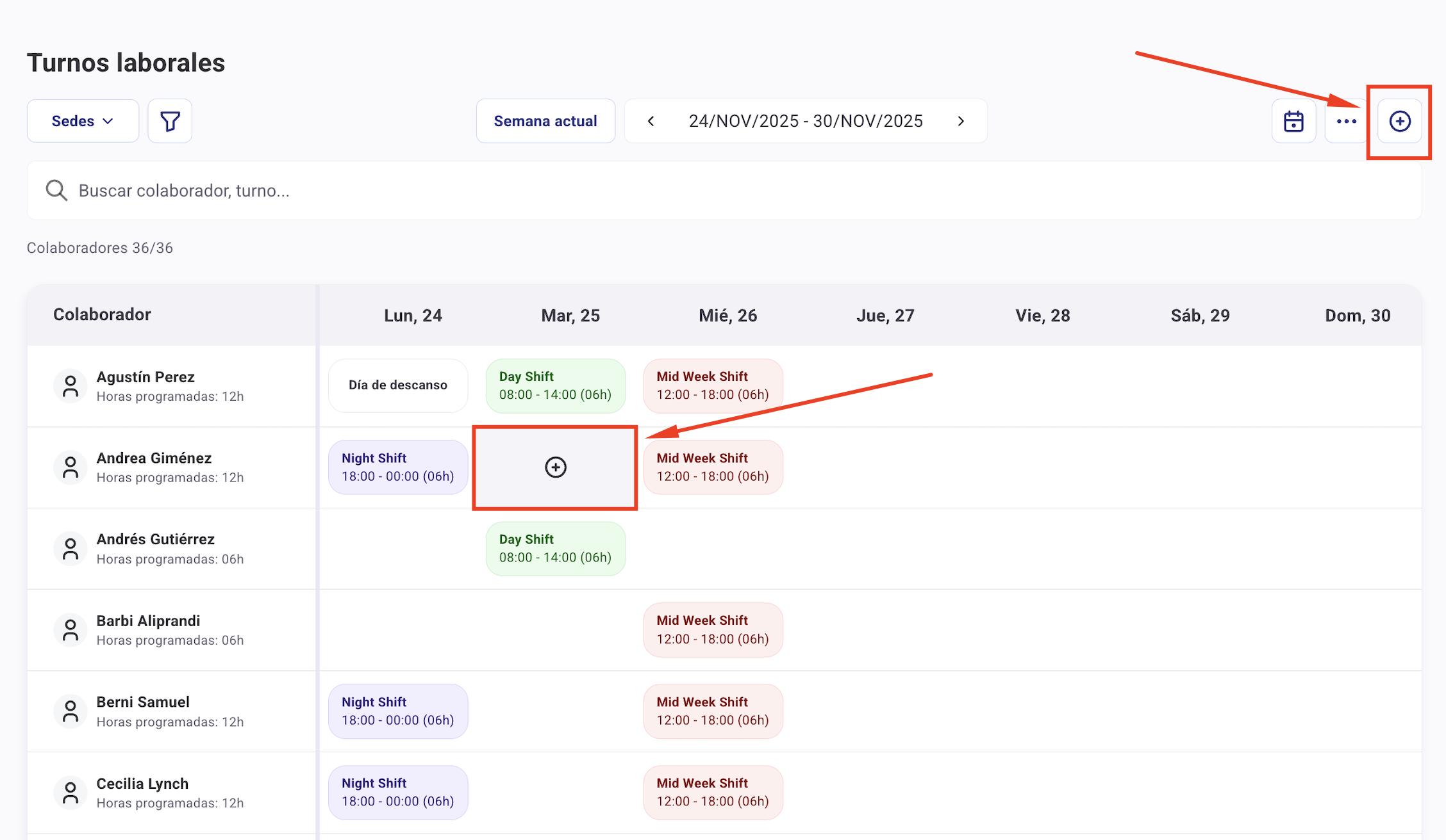 3. Puedes seleccionar el botón de "+" o hacer click en el día correspondiente al usuario, para asignar un turno laboral o día de descanso.