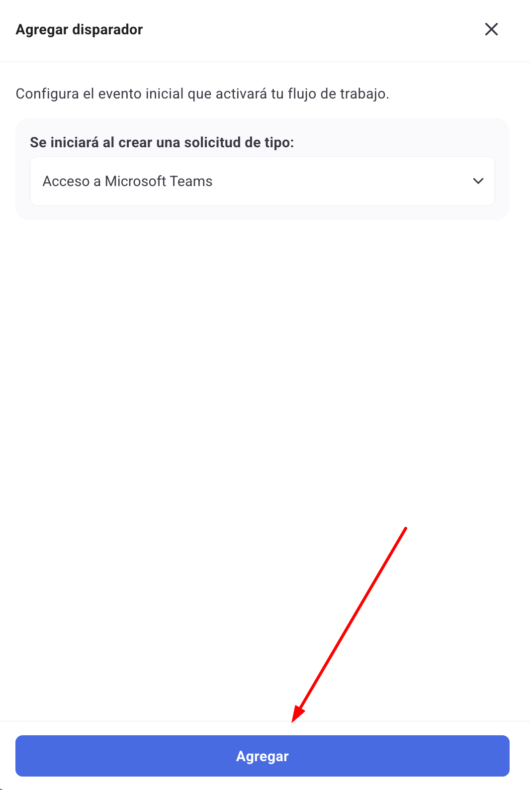 Aquí debemos seleccionar el tipo de servicio que dará inicio al flujo. Una vez seleccionado haz click en "Agregar".