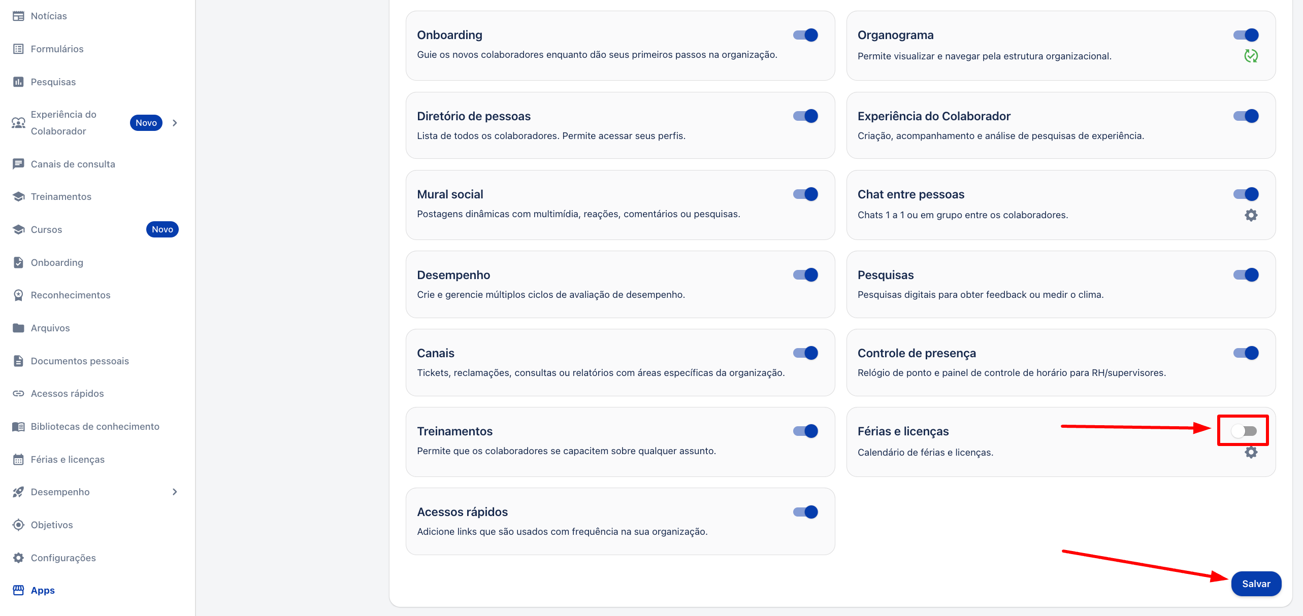 2. A partir daí, ative o módulo “Férias e licenças" e clique em “Salvar":