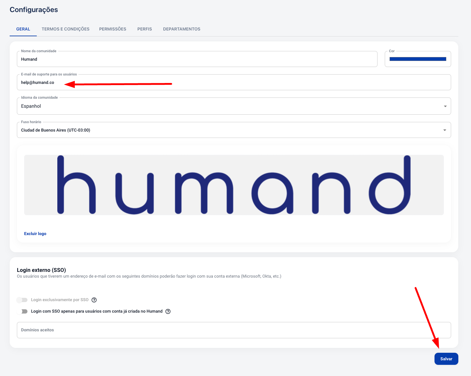O e-mail de suporte da comunidade é usado para redefinir as senhas dos usuários que não têm um e-mail configurado em seu perfil. Assim, se eles clicarem em “Esqueci minha senha”, um e-mail será enviado para o e-mail configurado para o suporte, que redefinirá a senha do colaborador.