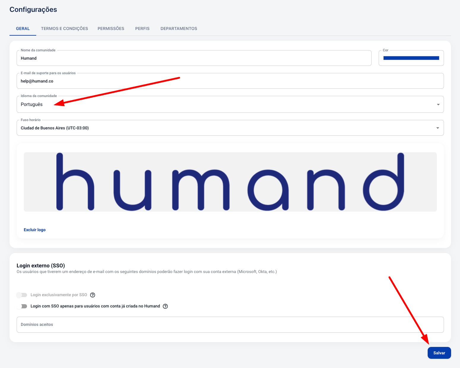 3. Modifique o idioma no campo "Idioma da comunidade".