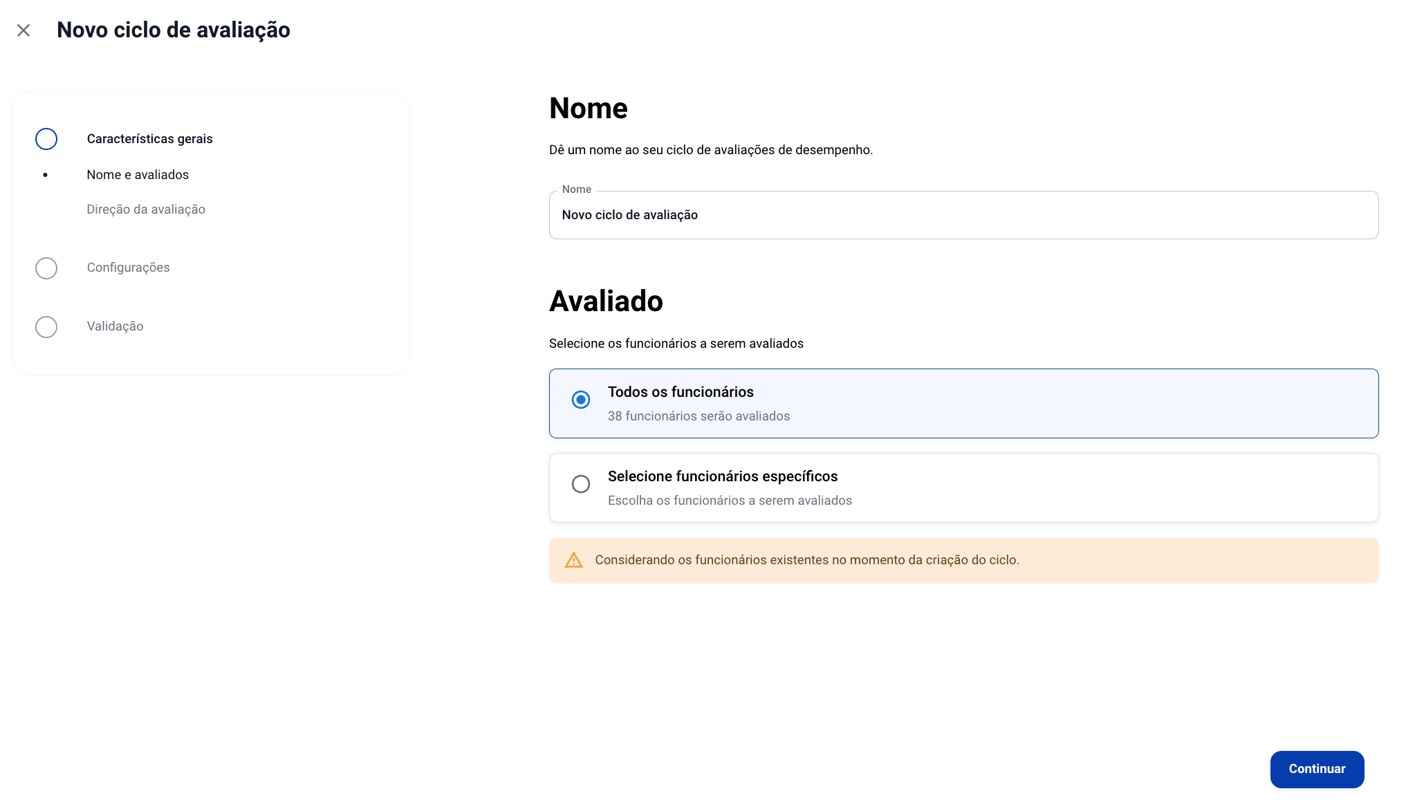 Estabelecer o nome do novo ciclo e selecionar os colaboradores a serem avaliados.