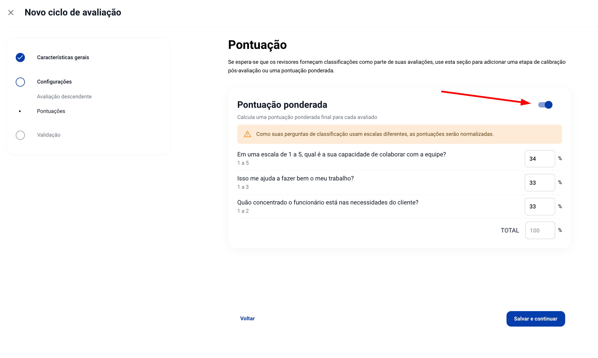 Para obter a pontuação ponderada de cada pessoa avaliada, a soma da porcentagem das perguntas deve dar 100%.