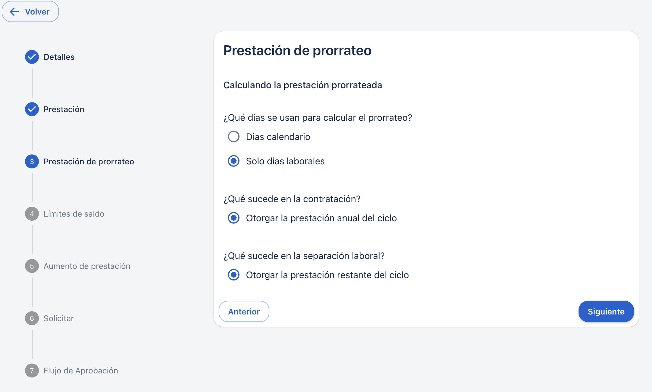 A seção de Prestação para as férias no México deve ter as seguintes configurações: