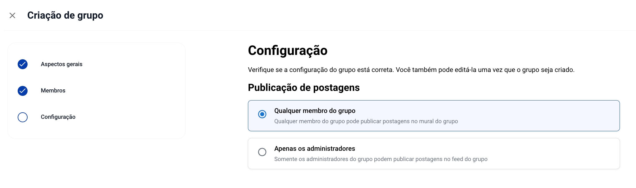 6. Configurações: Determine quem pode postar no grupo, de acordo com as opções abaixo: