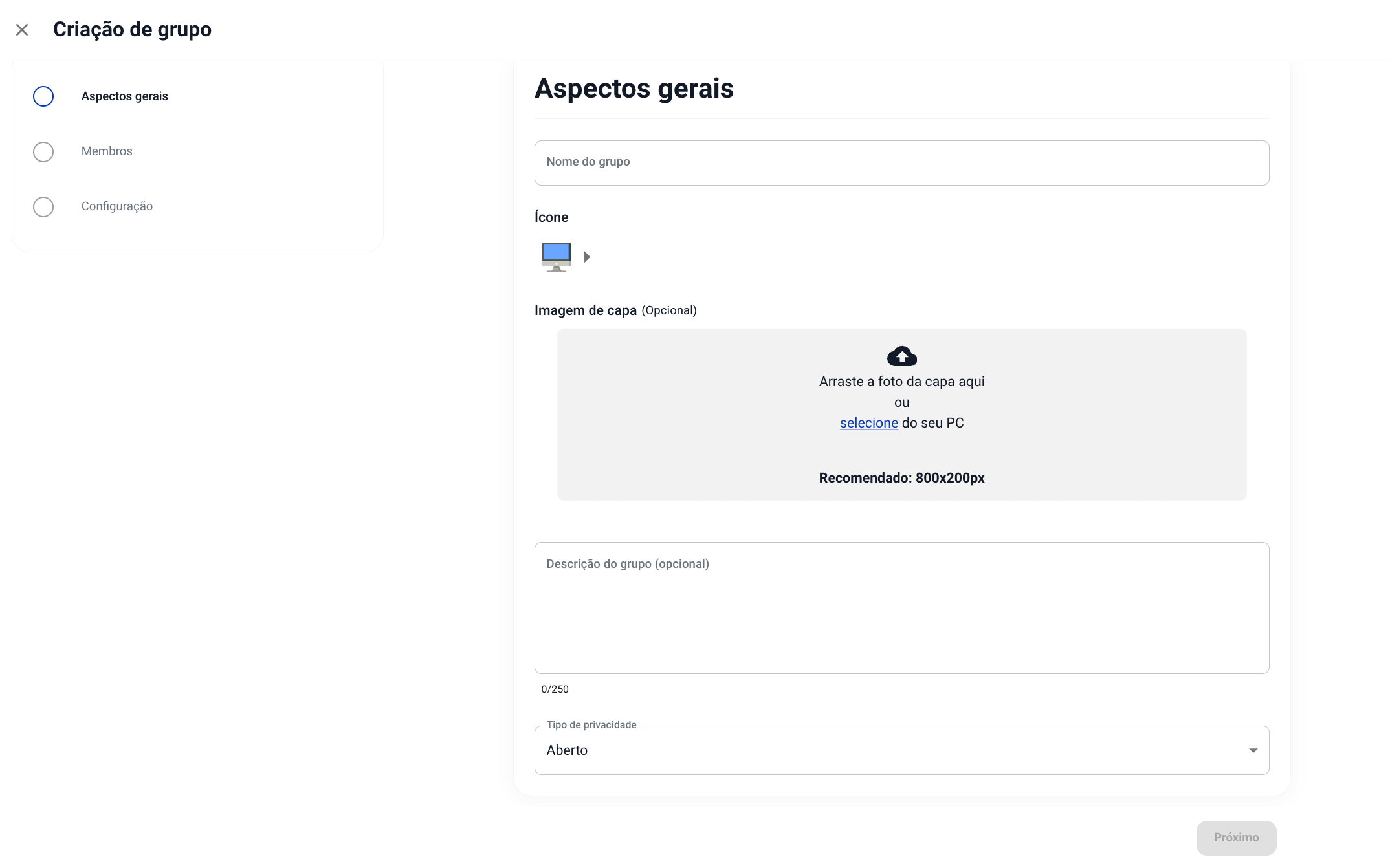 4. Criação do grupo: Agora você precisa configurar os aspectos gerais do grupo:
