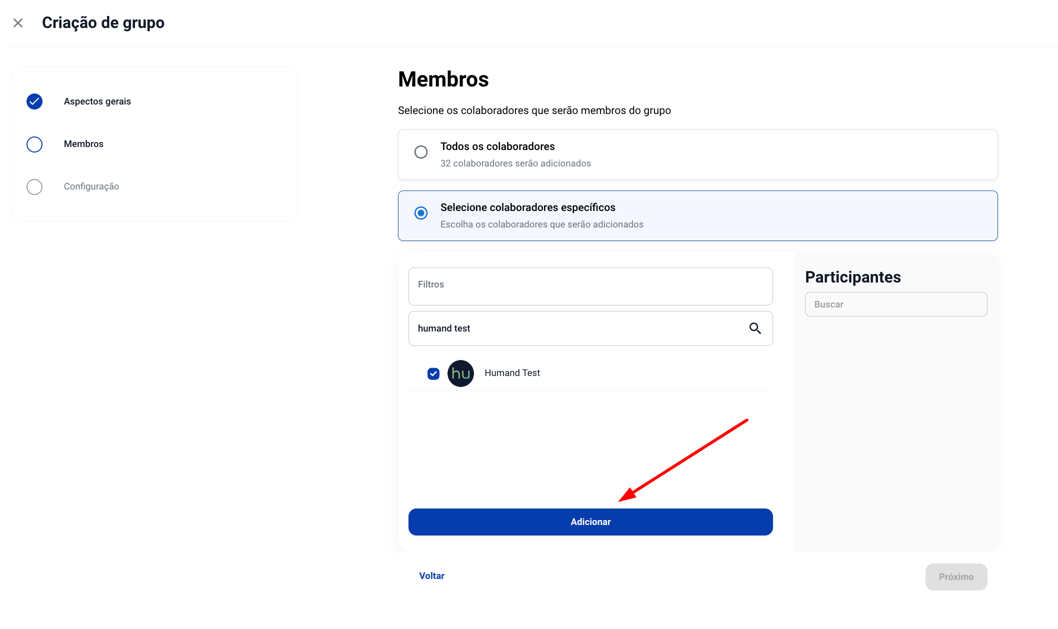 5. Membros: Defina os membros que farão parte do grupo. É possível selecionar todos os usuários ou escolher colaboradores específicos, utilizando as segmentações da comunidade ou realizando uma pesquisa manual.