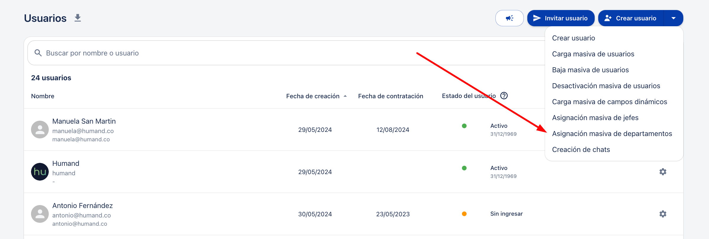 3. A partir do botão "Criar utilizador" deves entrar na opção “Atribuição massiva de departamentos”.
