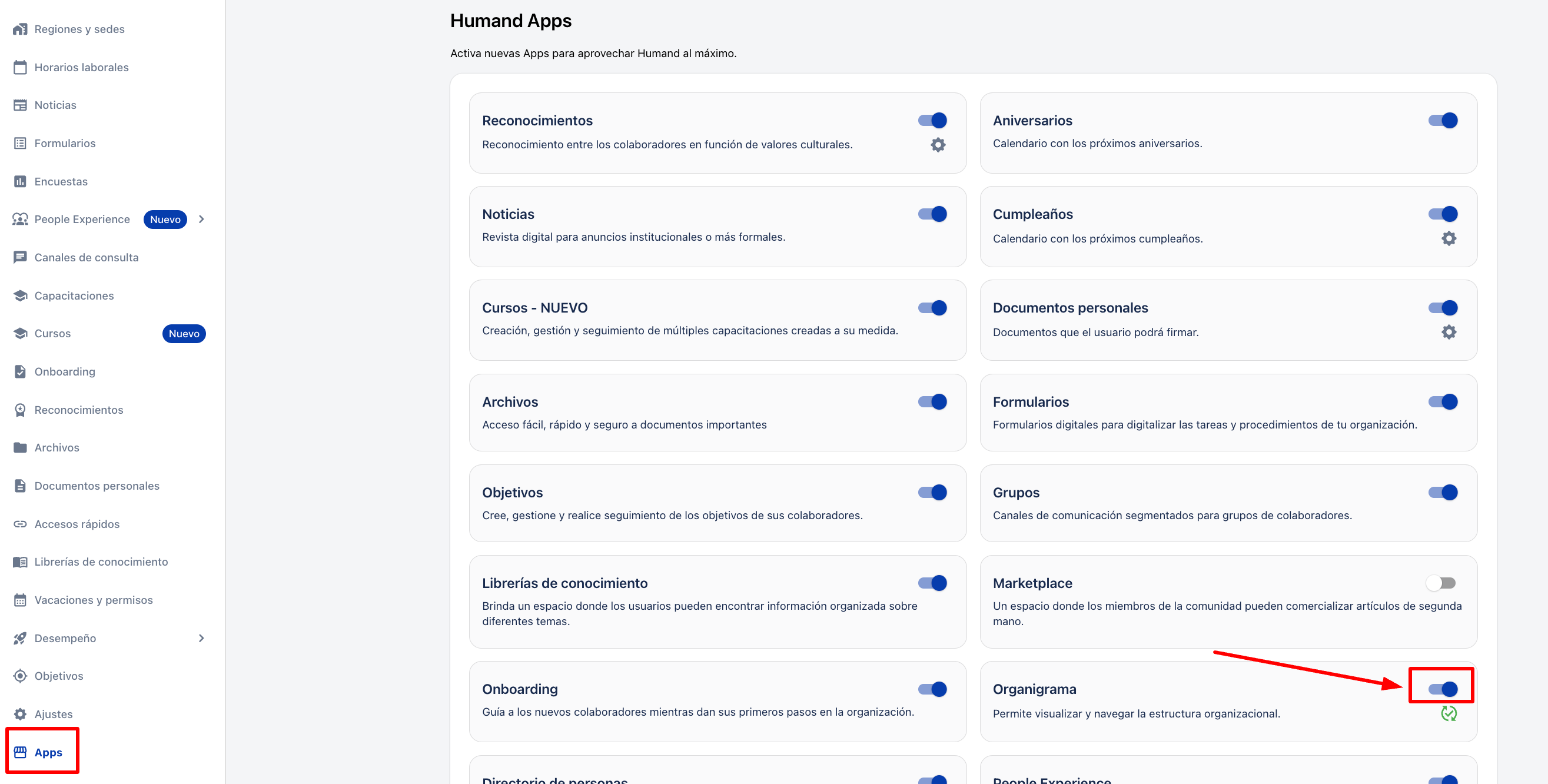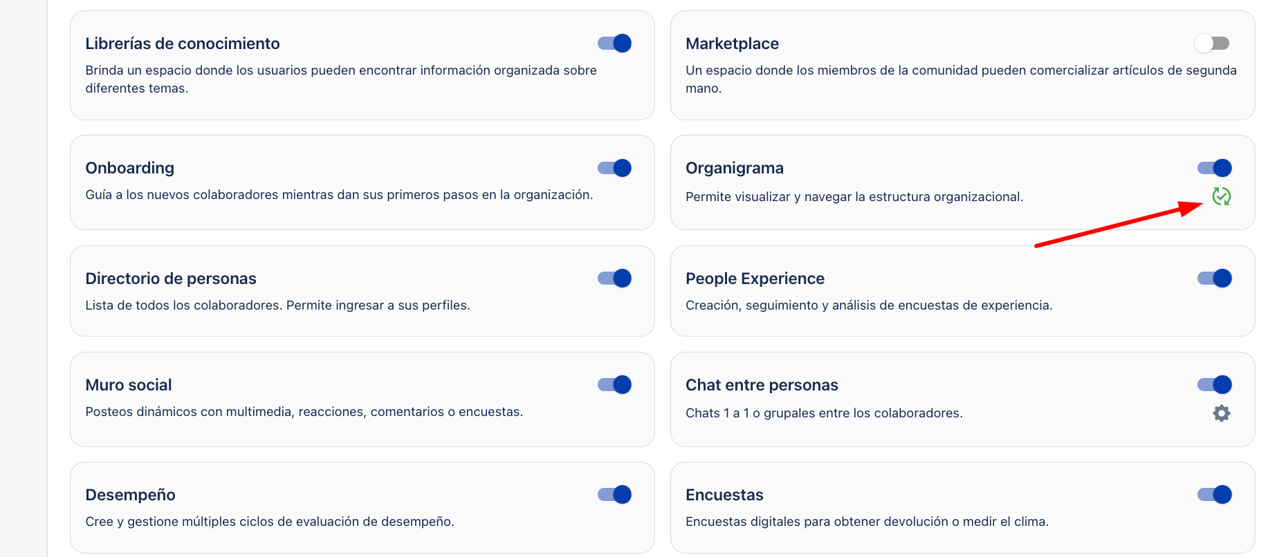3. Ativar ou desativar, dependendo se queremos que o módulo fique ligado ou não, o botão de "Organograma".