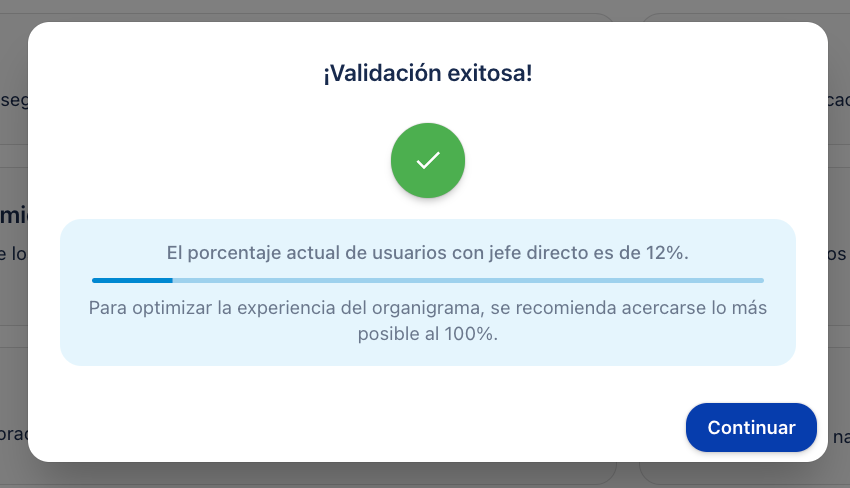 Além disso, a partir do botão de validação ✅ podemos visualizar qual é a percentagem de utilizadores com chefe direto atribuído. Para otimizar a experiência do organograma, recomenda-se aproximar-se o mais possível dos 100%.