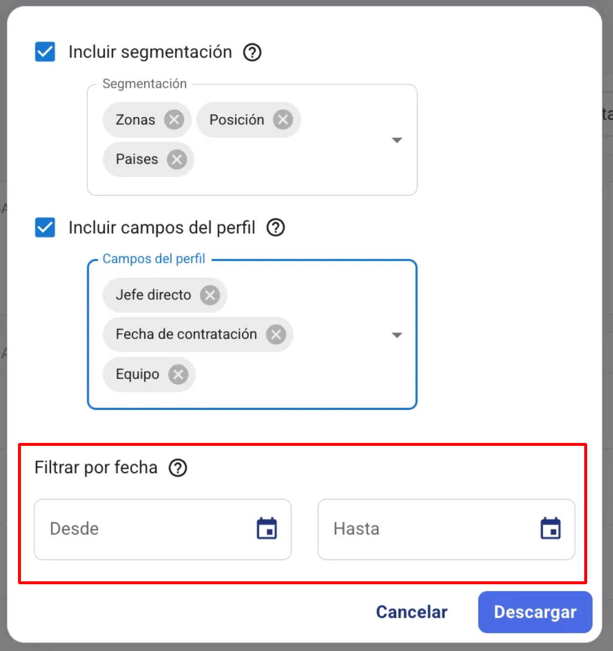 4. Lá poderás selecionar que segmentos ou campos de perfil desejas que o relatório inclua. Podes incluir os que necessitares.