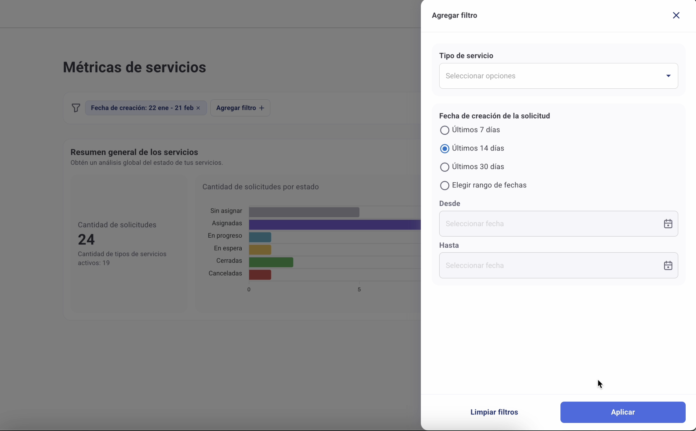 Além disso, pode filtrar por dois critérios: tipos de serviço e data de criação.