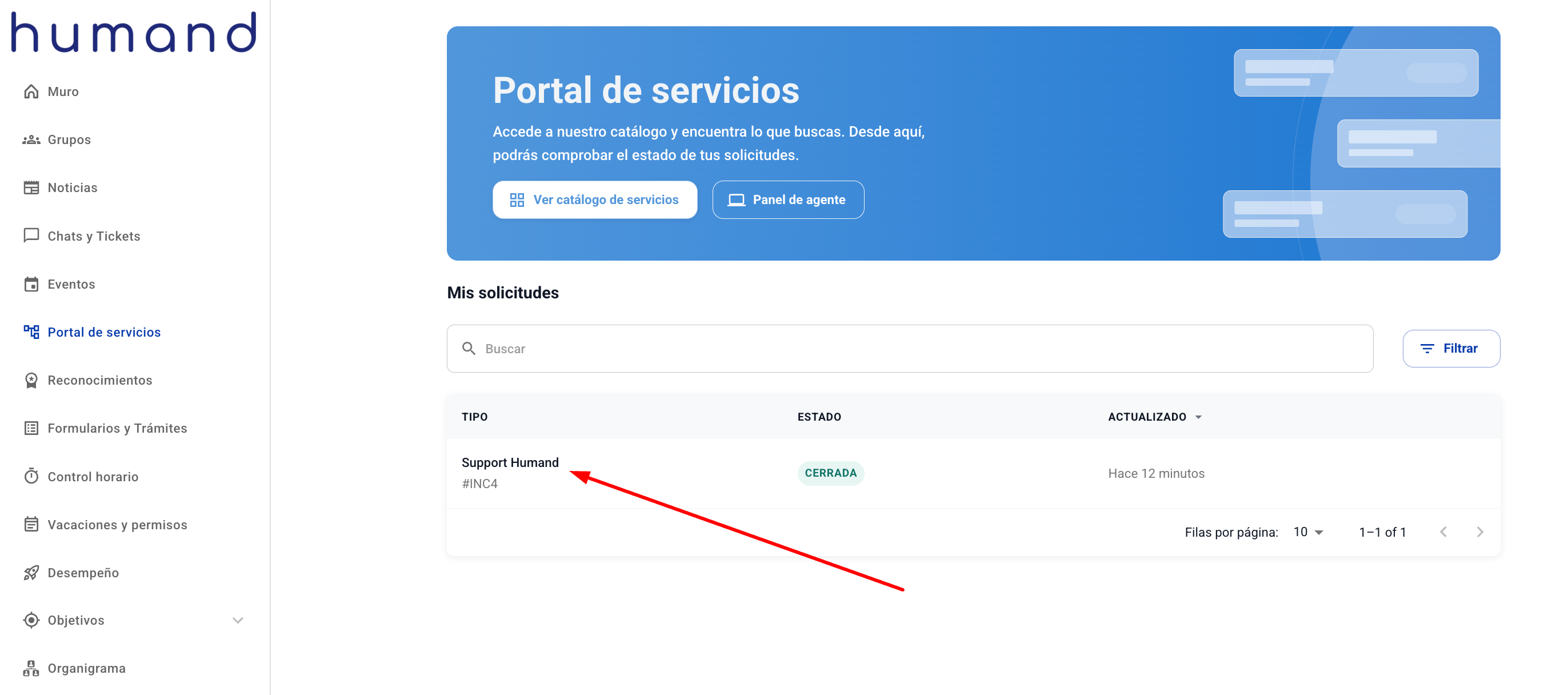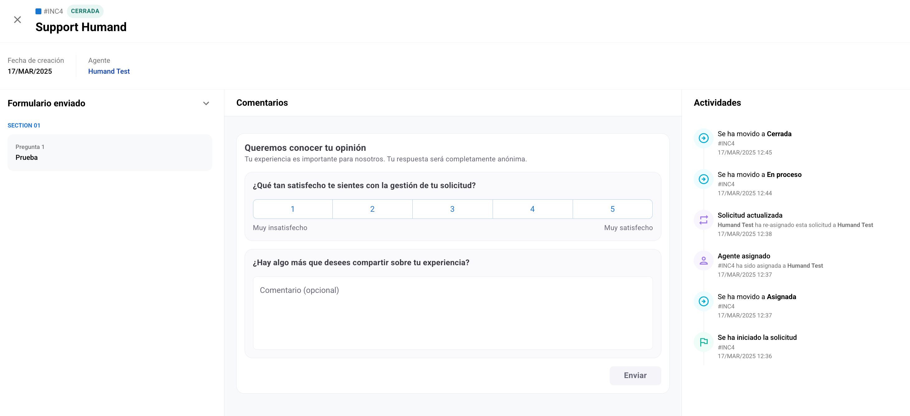 Uma vez terminado o pedido de Gestão de Serviços, o solicitante terá a possibilidade de completar o inquérito de satisfação, a seguir explicamos os passos que deves seguir para o fazer, seja a partir do Humand Web (PC) ou da Humand App: