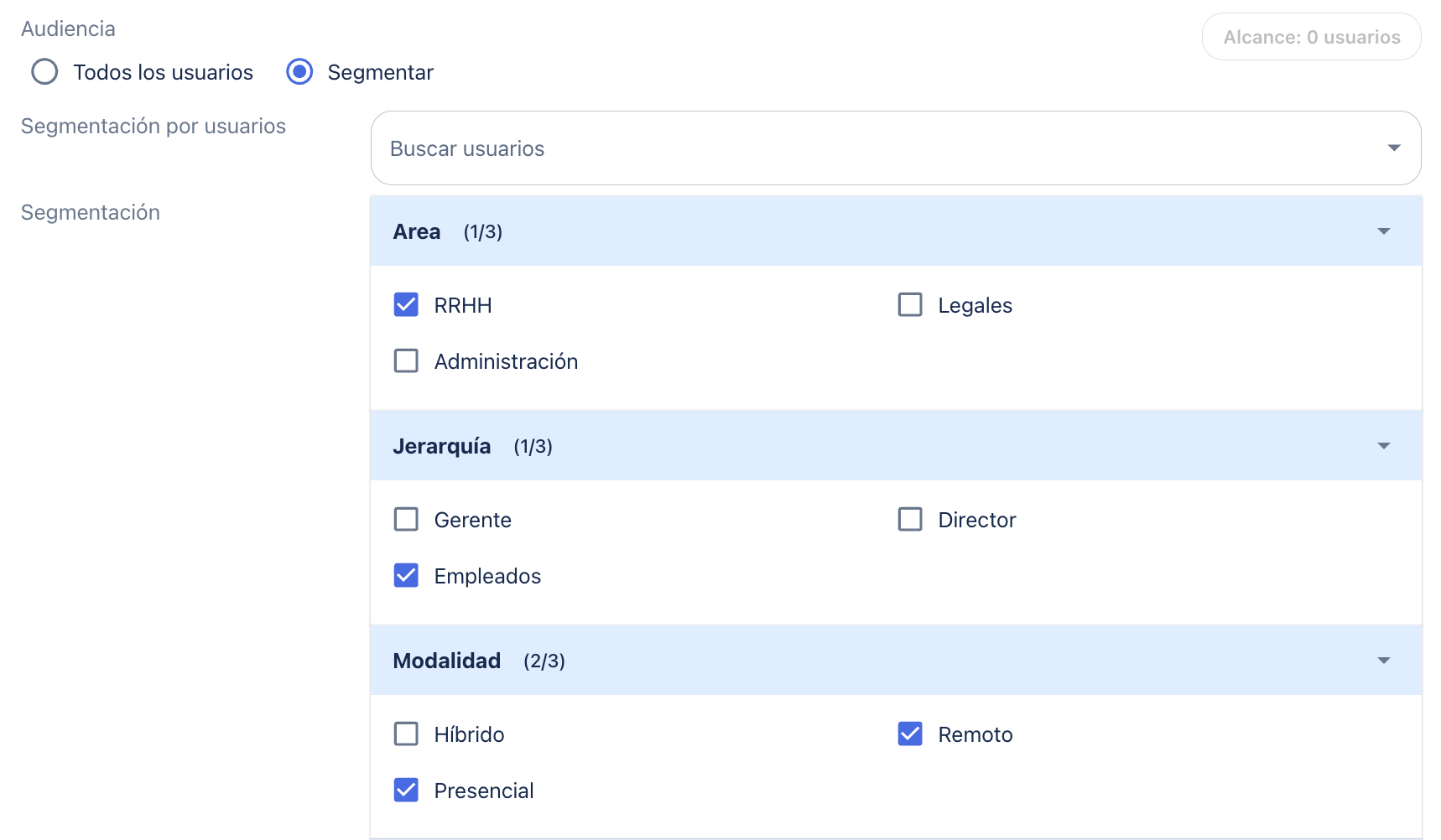 Na Humand, a lógica de segmentação é AND entre categorias e OR dentro de uma mesma categoria