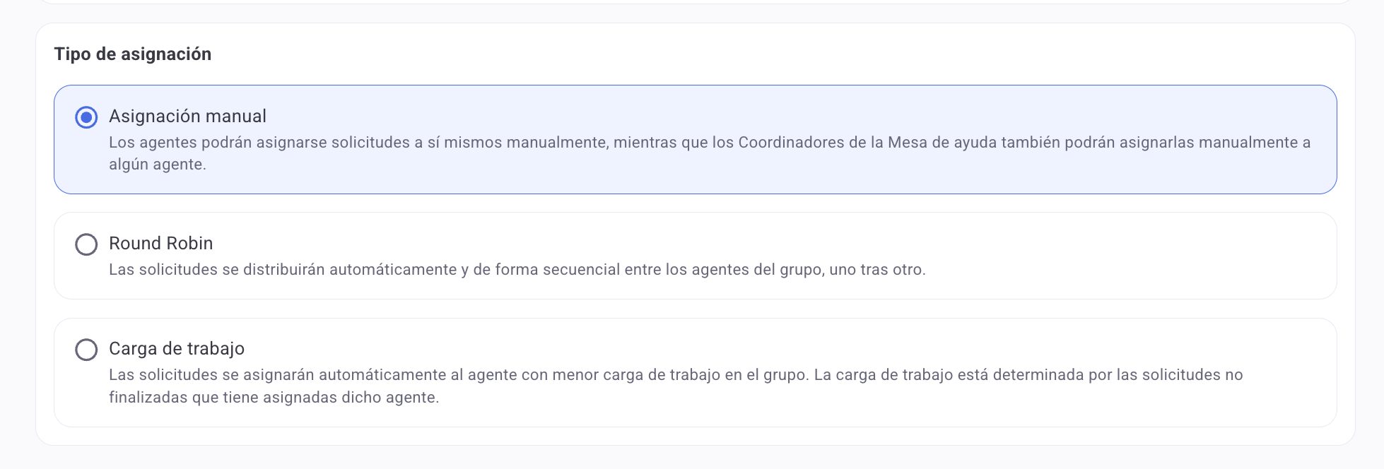 Depois, na secção de "Tipo de atribuição" poderás selecionar que tipo de atribuição terão os pedidos que esse grupo de agentes receber. Esta seleção define como se distribuem automaticamente os pedidos que entram no grupo. O método escolhido aplica-se a todos os novos pedidos geridos por esse grupo e assegura uma estratégia de atribuição consistente e automatizada.
