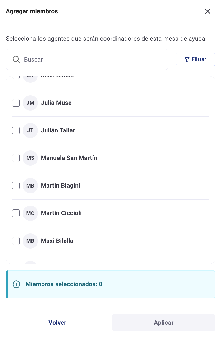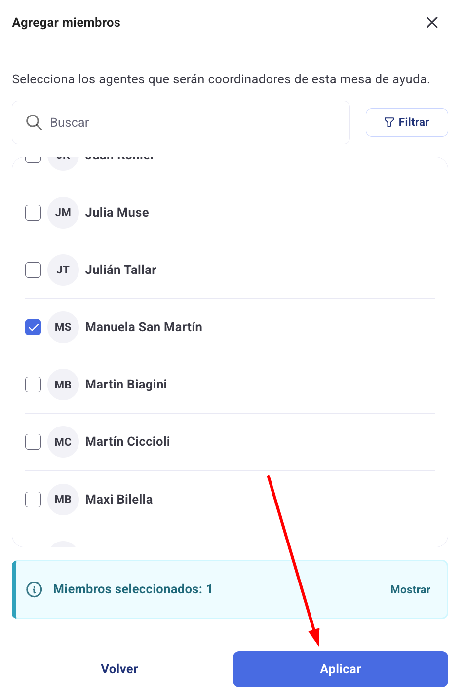 6. Podes selecionar os agentes individualmente, com a opção de filtrar os utilizadores por grupos de segmentação. Uma vez selecionados os agentes, finalizamos clicando em “Aplicar”. Desta forma, já temos criado o nosso grupo de agentes dentro de uma mesa de ajuda.