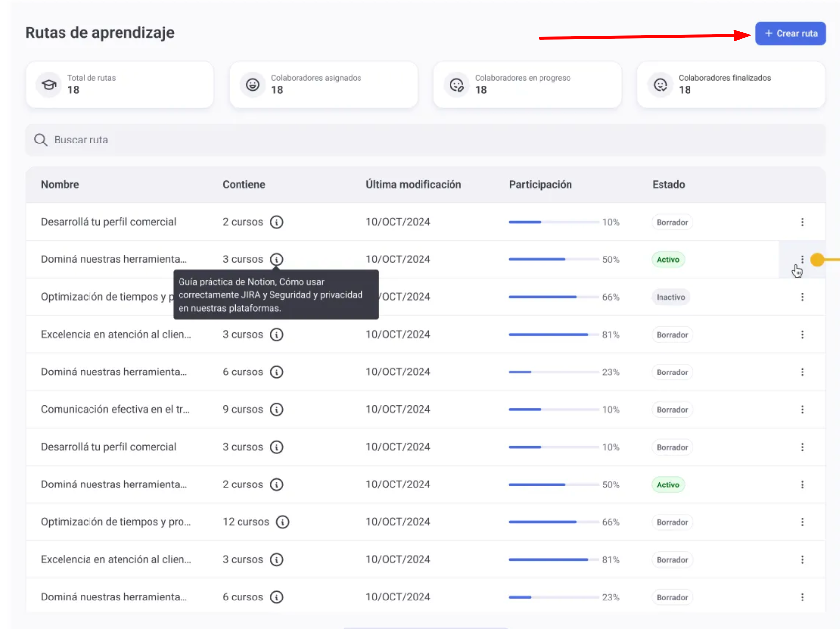 Desde o módulo de Aprendizagem, é possível criar percursos compostos por múltiplos cursos, garantindo uma experiência formativa mais guiada e estruturada para os colaboradores.