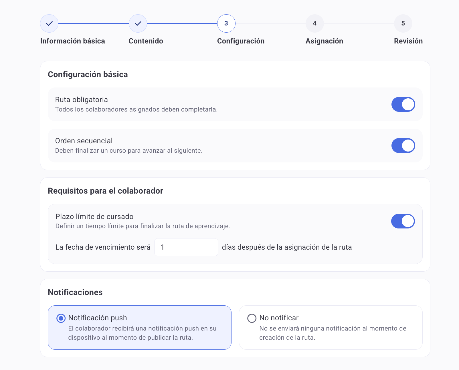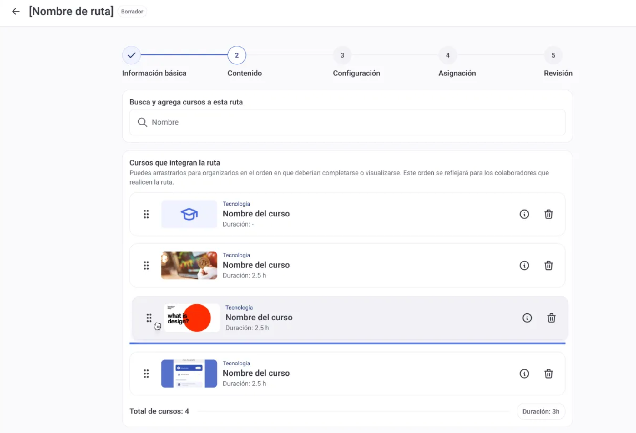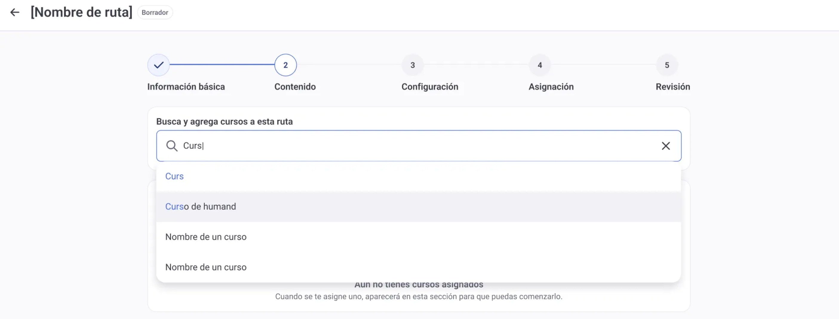 O segundo passo consiste em selecionar o conteúdo (cursos) que o percurso terá. Para selecionar um curso, é necessário procurá-lo pelo nome. Aparecerão todos os cursos que já existam na Humand e estejam em estado Ativo.
