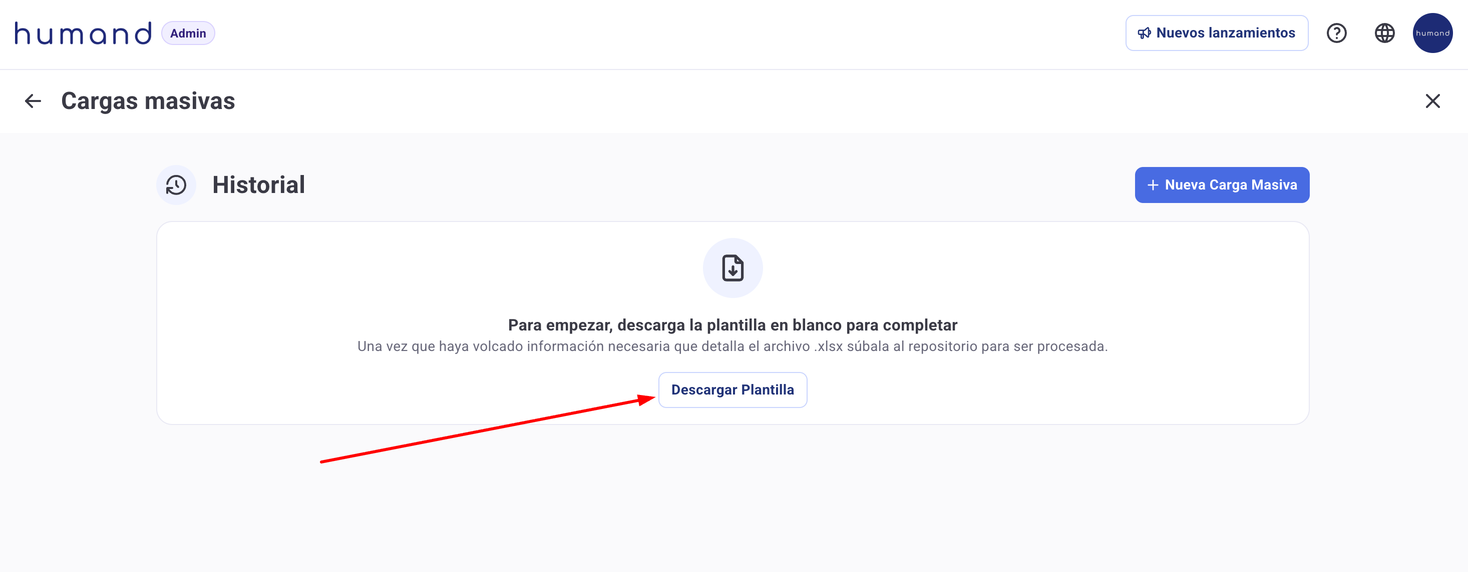 6. Uma vez completado e guardado o modelo, clica no botão "+ Nova carga massiva" para poderes carregar o ficheiro.