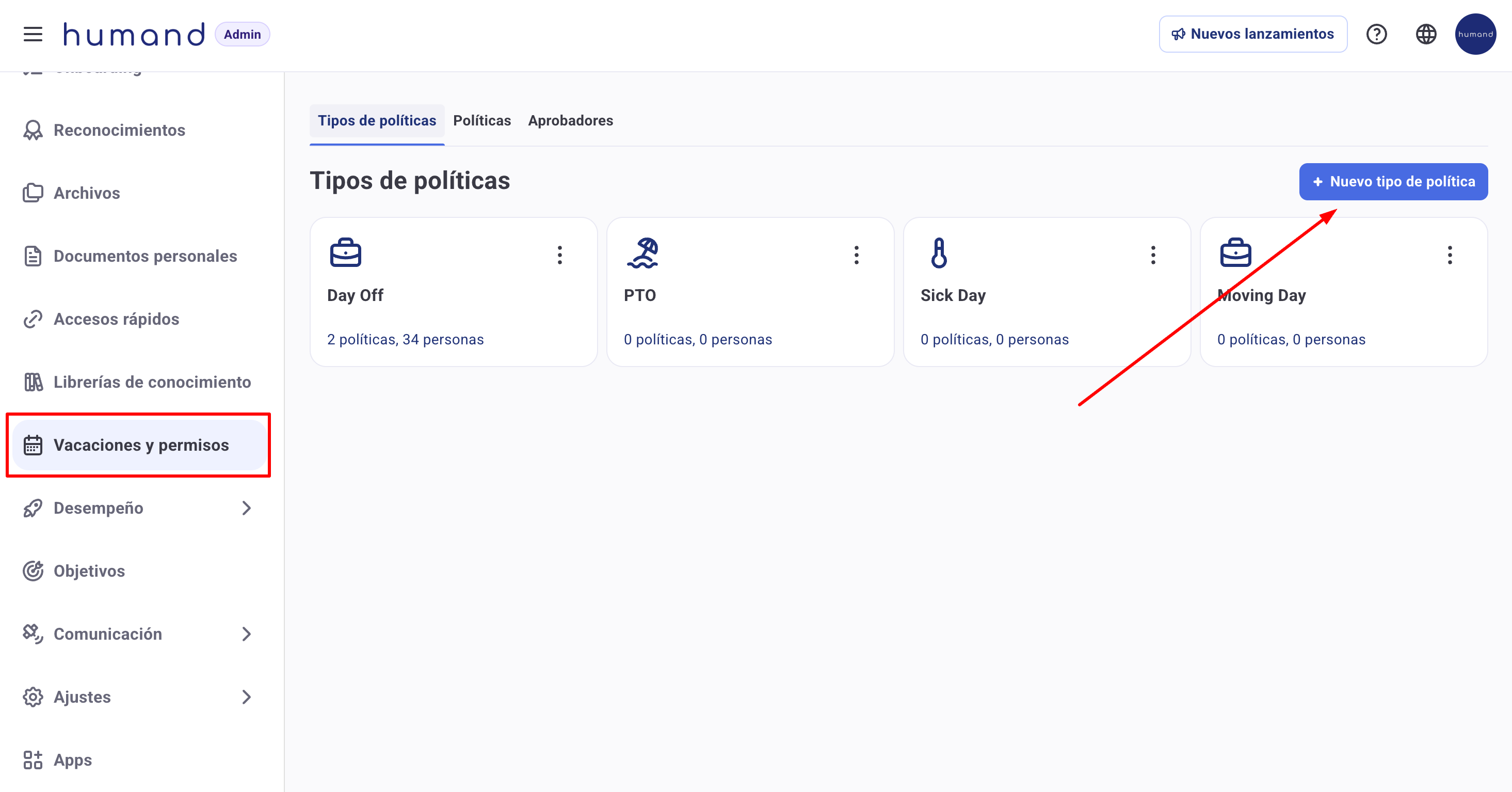 1. A partir de Humand Admin, acede à secção de "Férias e Licenças > Tipos de políticas".