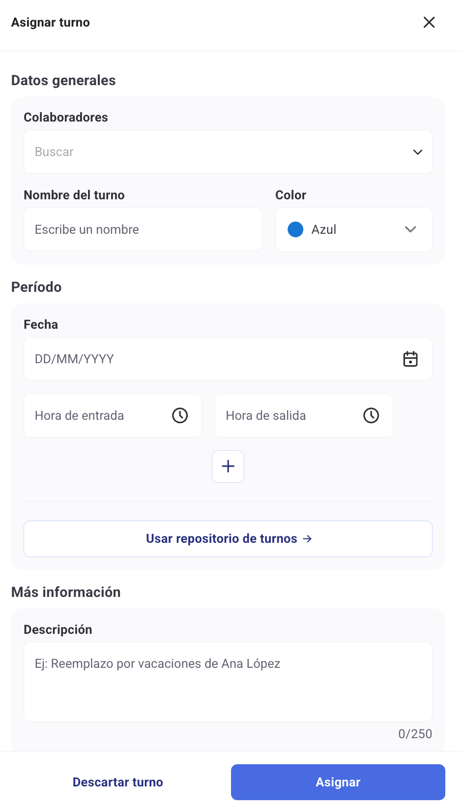 4. Uma vez dentro, deverás completar os campos correspondentes ao turno laboral a ser atribuído.