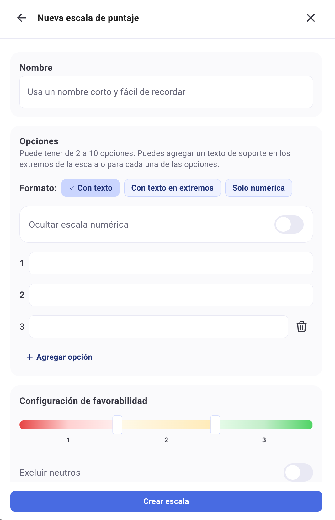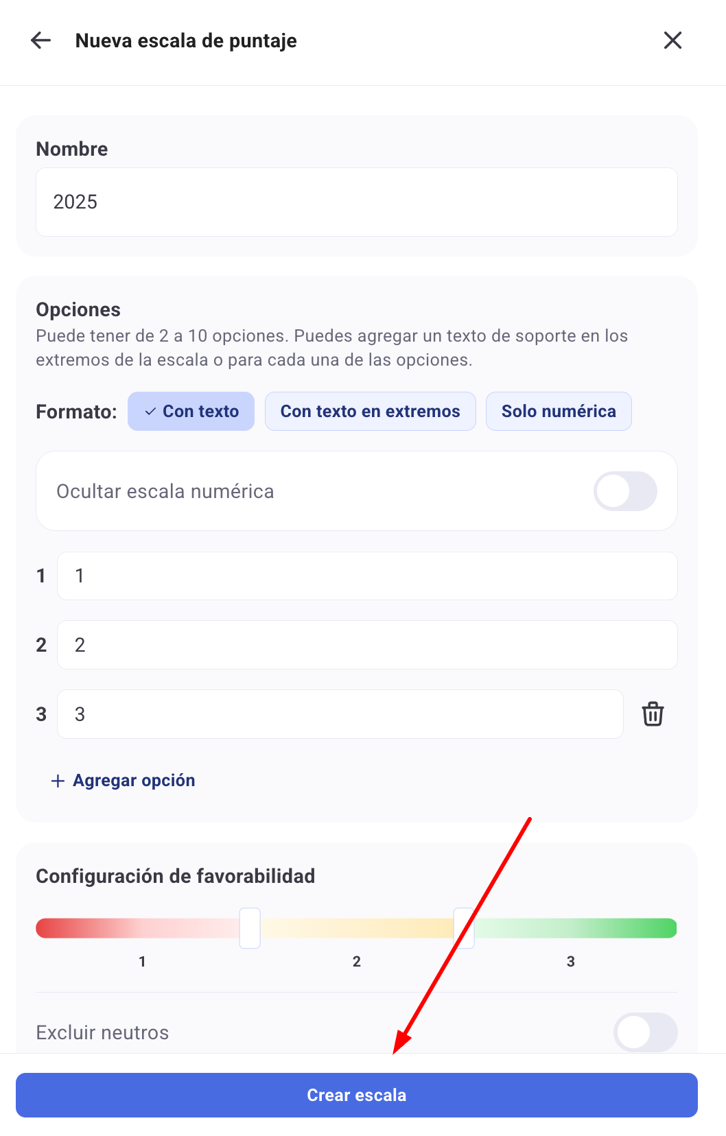 3. Uma vez preenchidos os campos, clica em "Criar escala", e pronto! A escala ficará disponível para utilizar nos teus inquéritos de experiência.