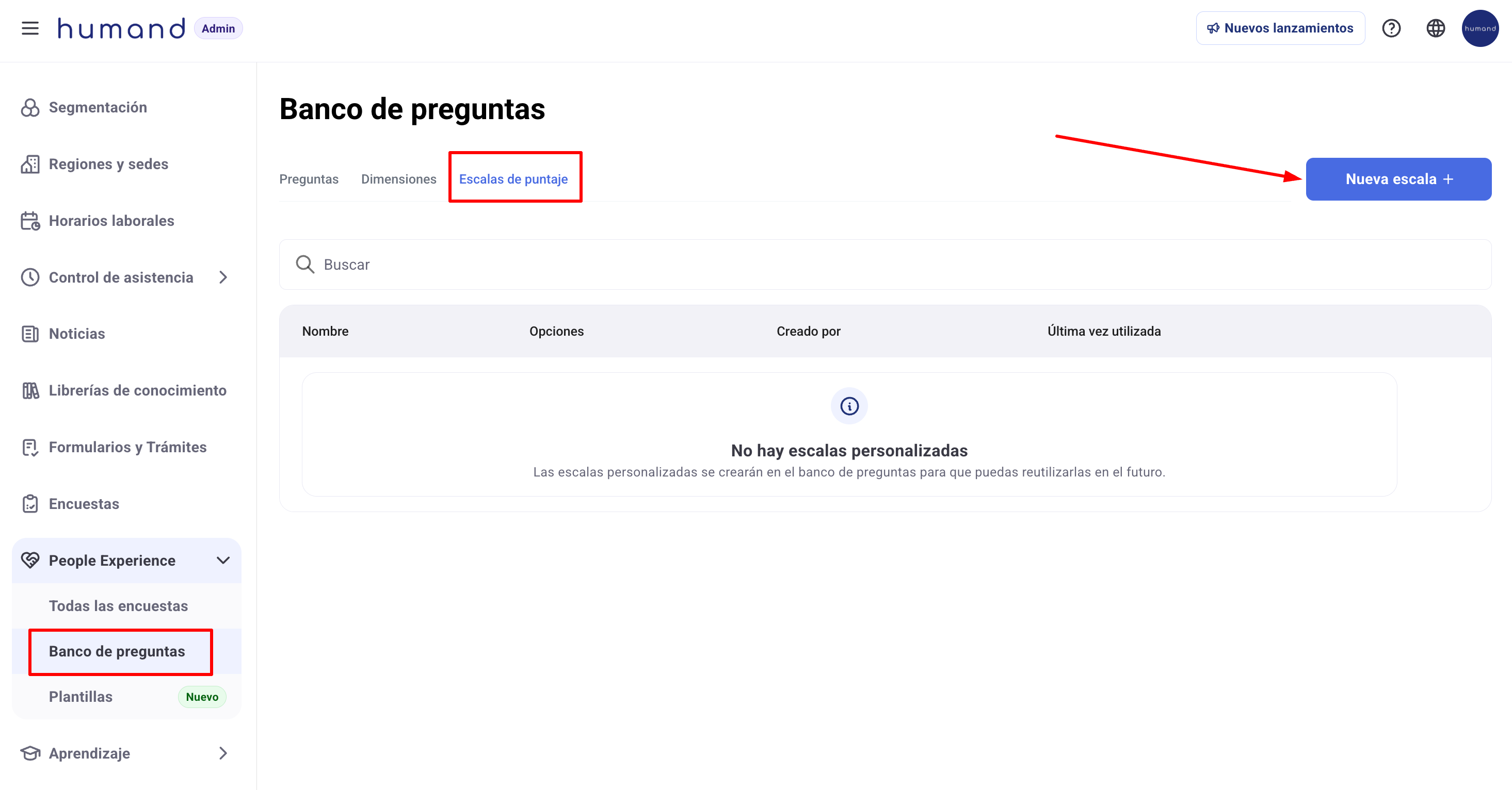 1. Aceder a uma das opções mencionadas anteriormente, por exemplo ao Banco de Perguntas a partir do Humand Admin. Depois clicar em "Nova escala +".