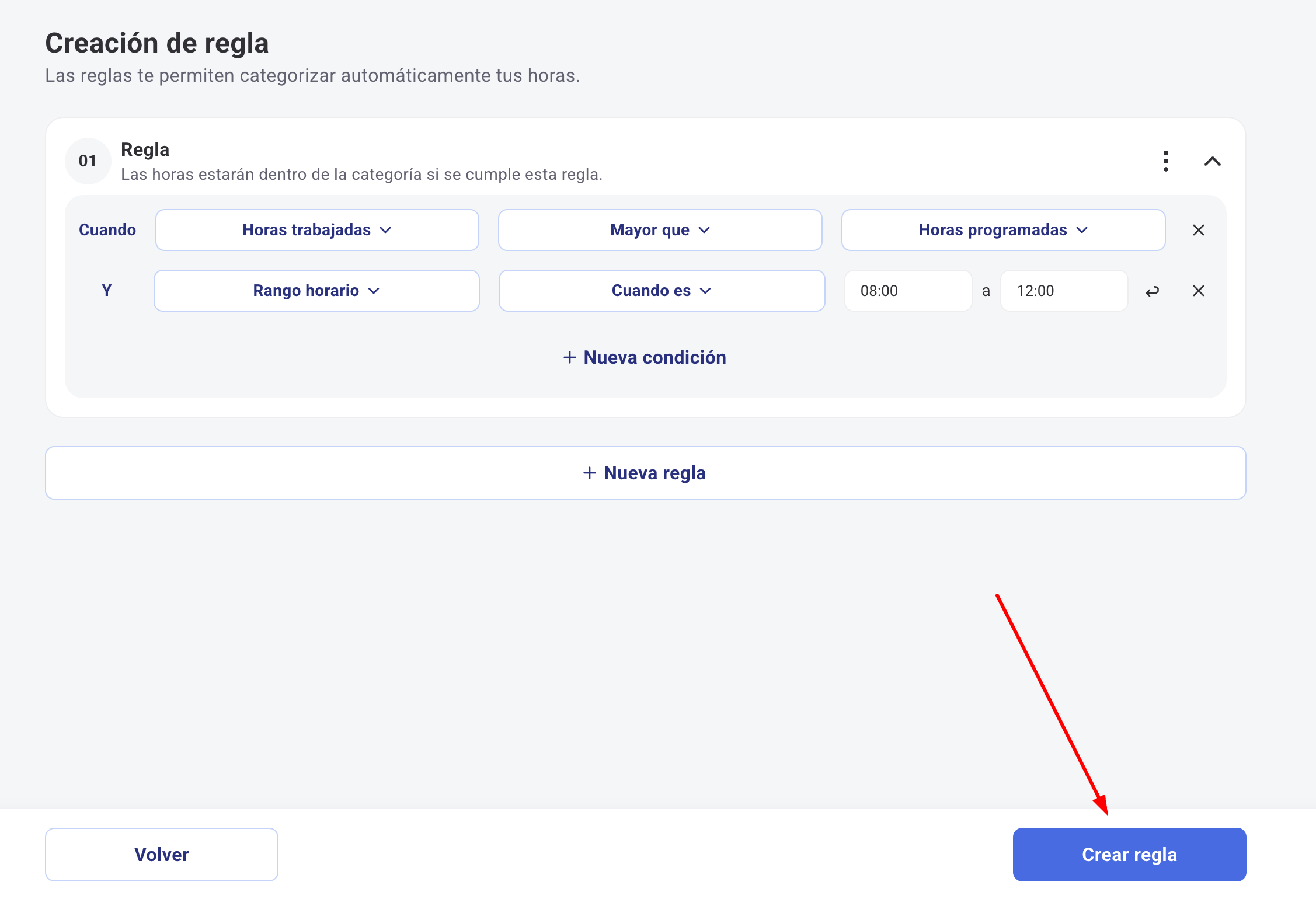 5. Depois, deves criar as regras correspondentes a essa categoria, que permitem definir logicamente quando as horas trabalhadas pertencem a uma categoria. Cada categoria pode ter uma ou mais regras. As horas são consideradas dentro da categoria quando todas as condições de uma regra são cumpridas.