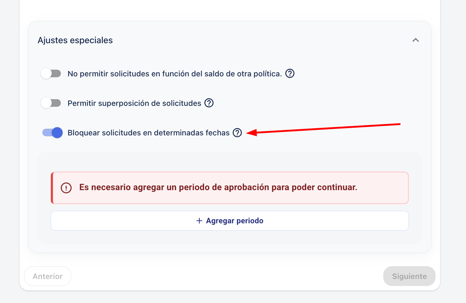 3. Na secção "Solicitar" vais encontrar um separador de Ajustes Especiais. Lá dentro, estará a opção "Bloquear pedidos em determinadas datas".